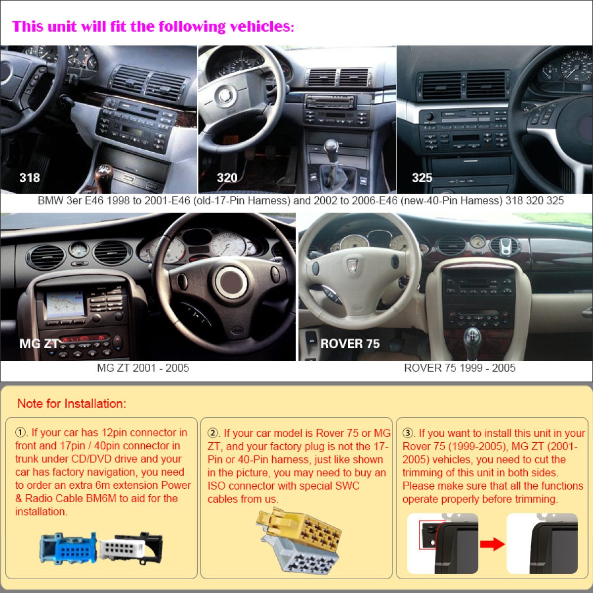 - BMW 3-та серия E46 1998-2001 със старата радиобукса със 17 пина "кръгли пинове"