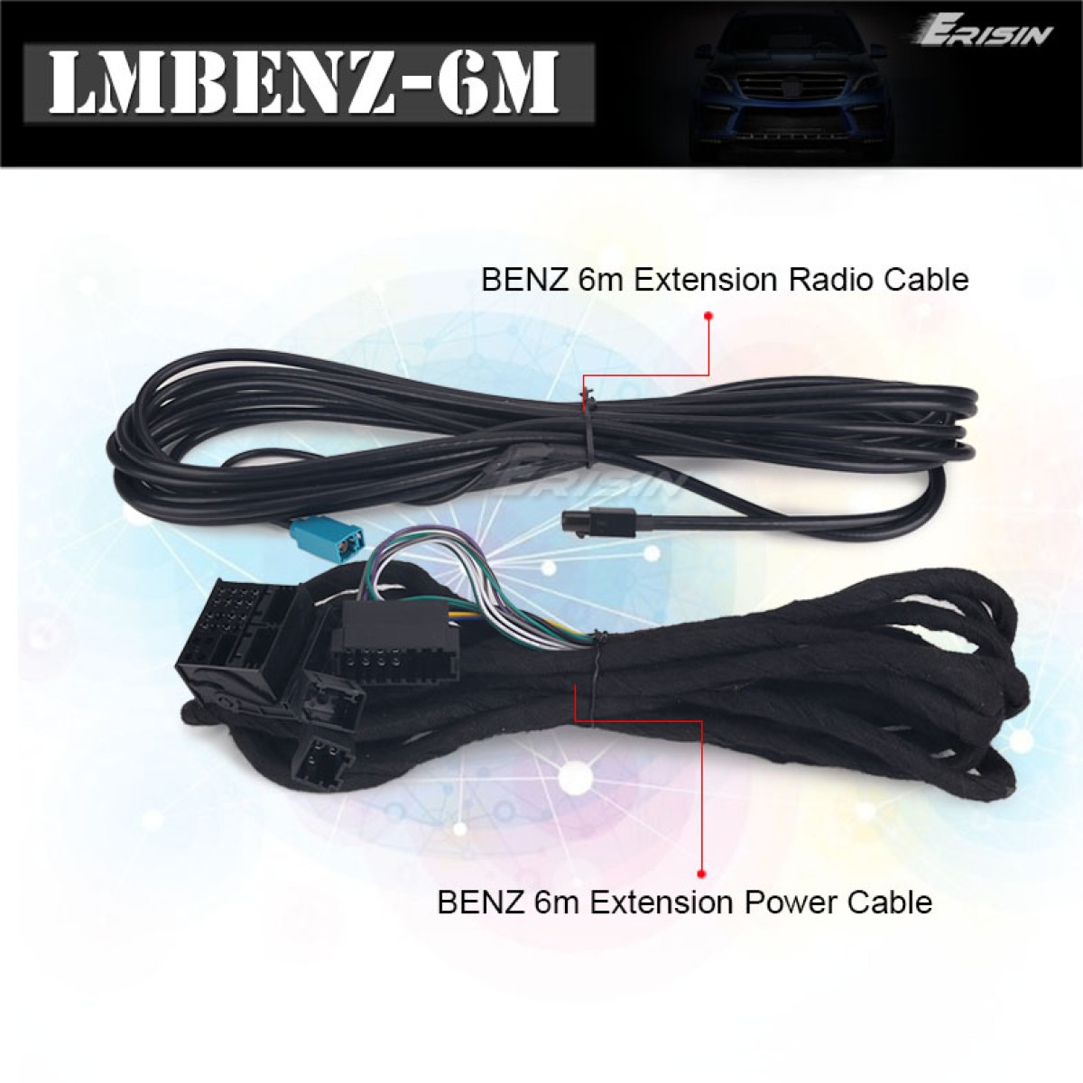 Erisin LMBENZ-6M представлява 6 метров кабел, който в единия си край завършва с Mercedes конектори, които се включват директно във Вашата фабрична букса, влизаща в радиомодула, както и Fakra конектор, към който свързвате Вашата фабрична радиоантена. А в другия си край, Erisin LMBM6-N завършва с букса Mercedes 40 pin (плоски пинове), т.е. фабричната Mercedes радиобукса. В комплектът е включен и 6 метров кабел, с който да удължите FM радиоантената си до централната конзола.