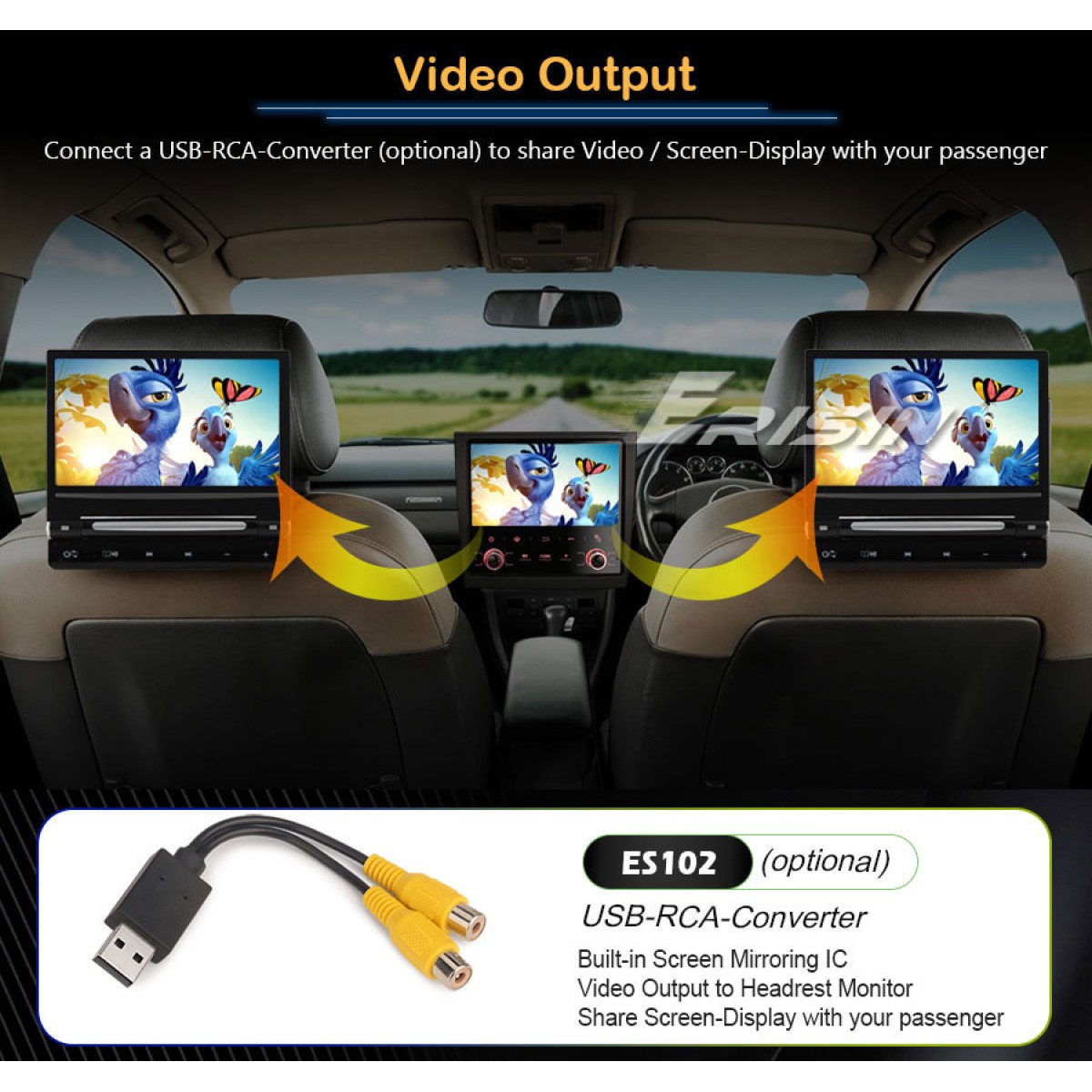 Това означава, че можете да го включите към USB порт на Вашата мултимедийна система Erisin и от него ще получите 2бр. RCA видео изходи за допълнителни монитори.