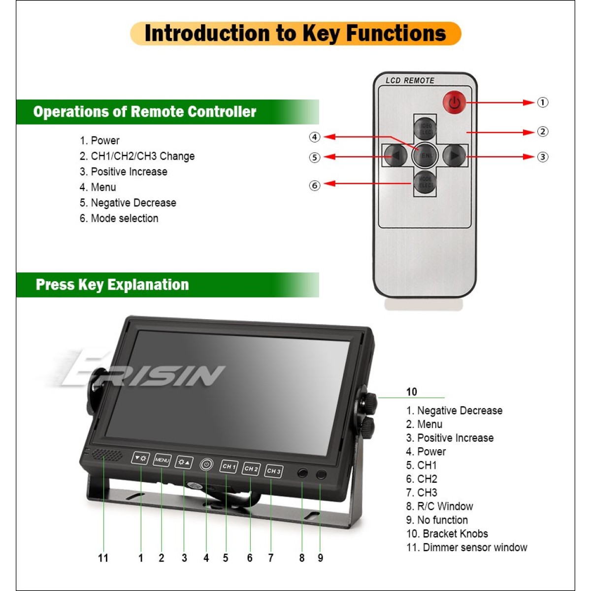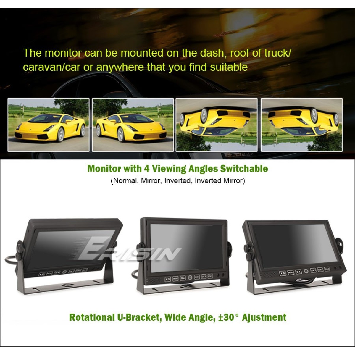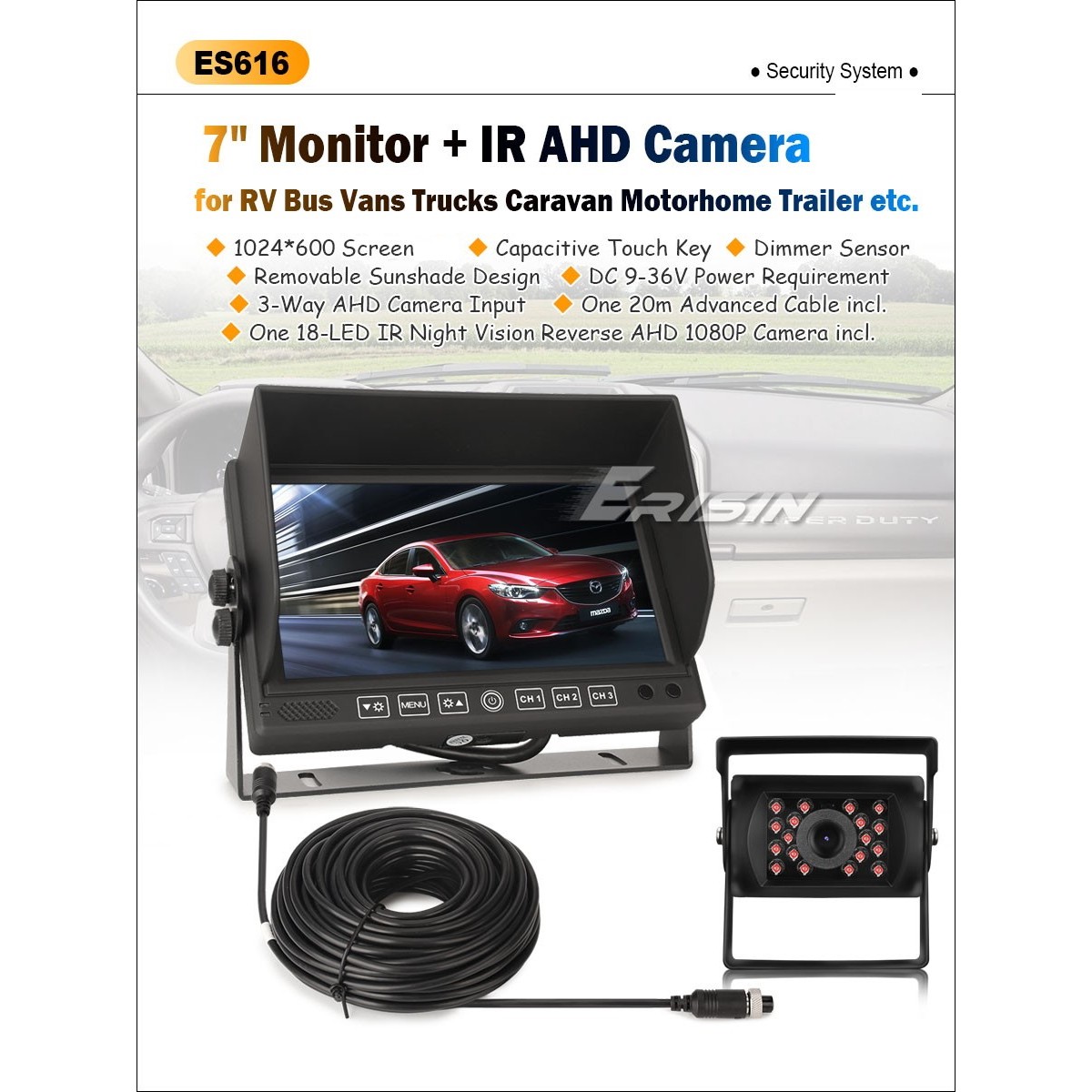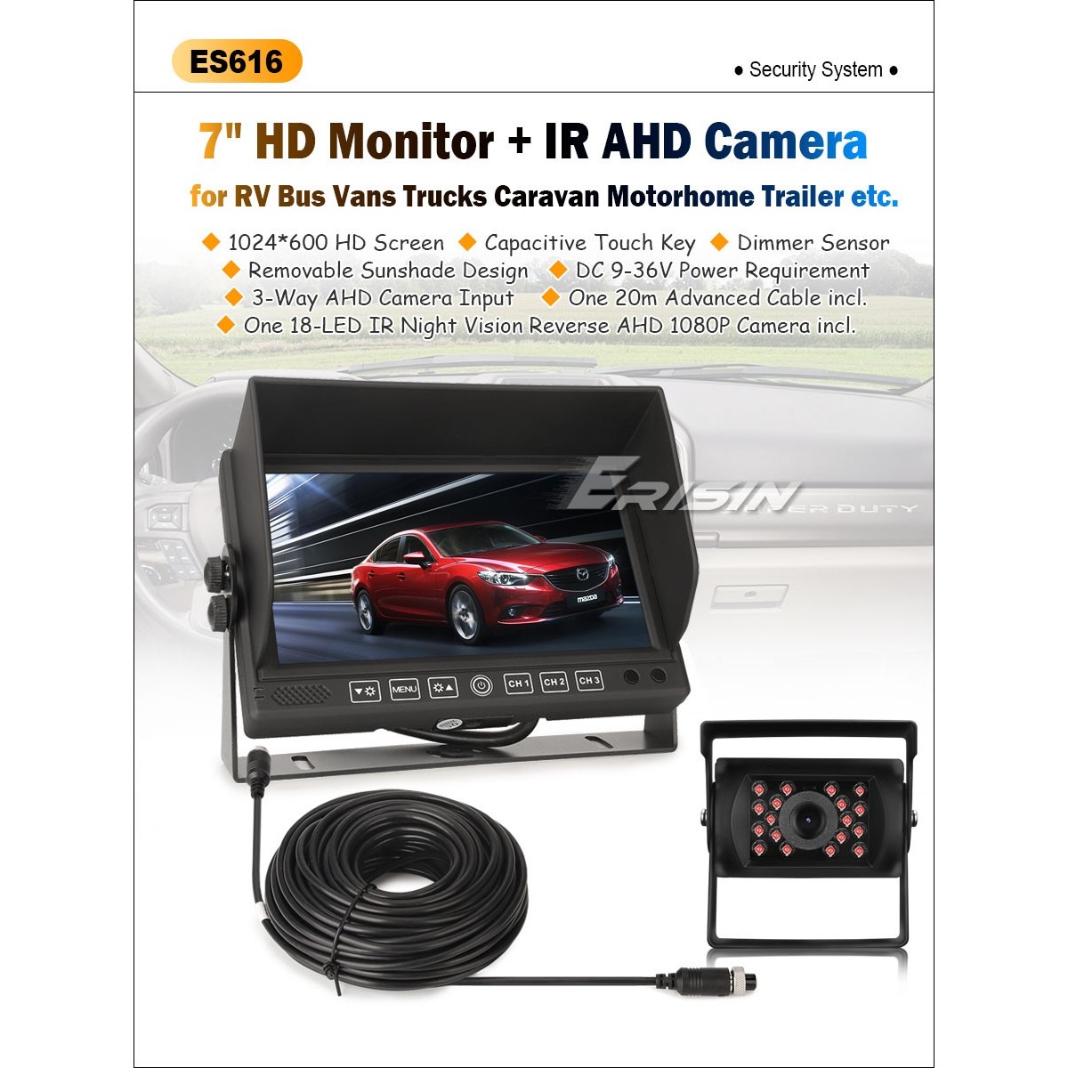 Моделът е Erisin ES616 и може да се каже, че това е един изключително стабилно работещ, масивен и качествен автомобилен монитор с резолюция 1024 * 600 пиксела, който е подходящ за всякакви автомобили, камиони, автобуси и др.