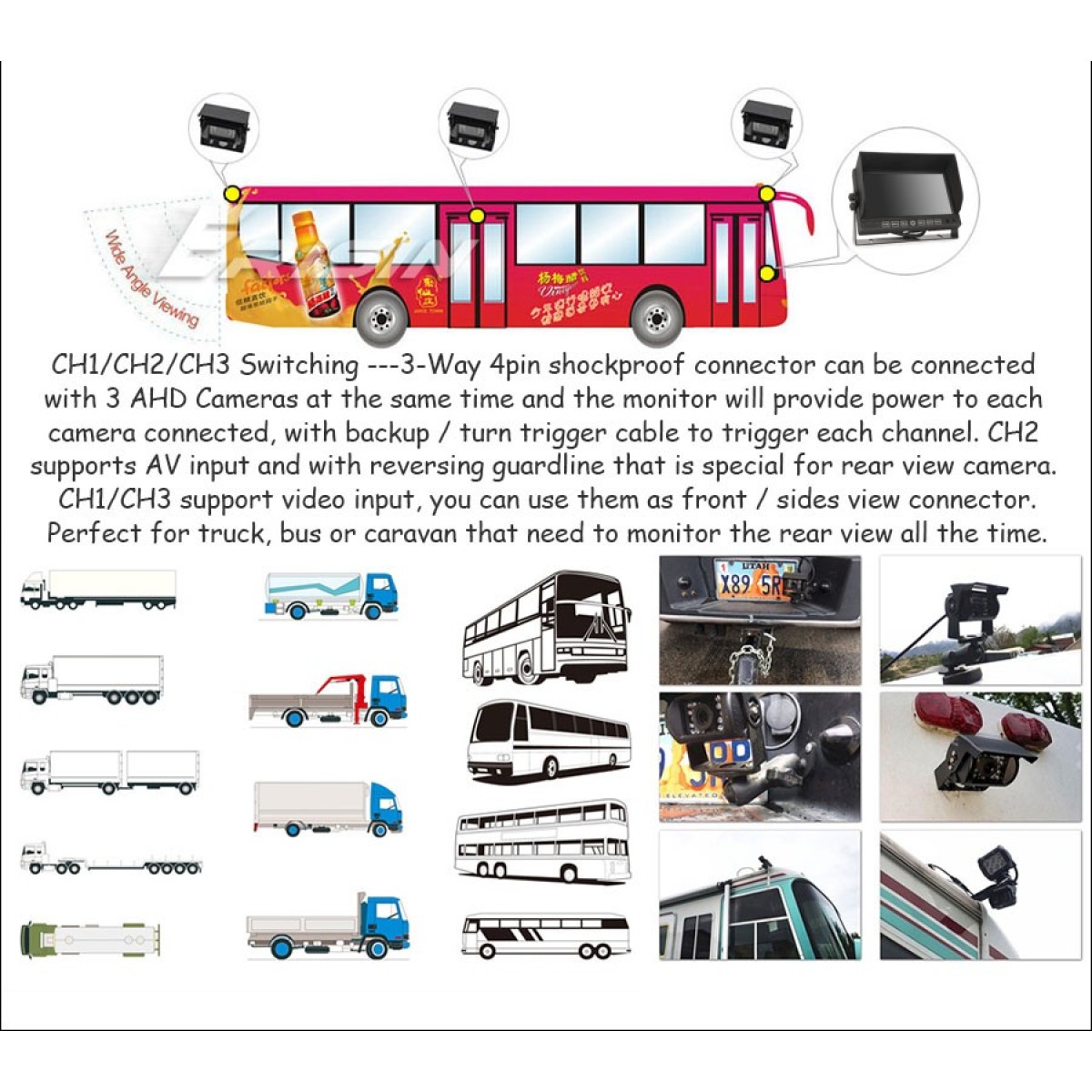 Предлагаме на Вашето внимание едно решение за онези автомобили, камиони, автобуси и т.н., които имат нужда от монитор, свързан към една или повече камери, с което да се осигури безопасността и спокойствието на водача. Предлагаме Ви 7 инчов монитор с метална рамка и стойка, AHD 1080p 25i камера за заден ход с дневен и нощен режим (автоматичен), 20 метров удължаващ кабел и дистанционно.