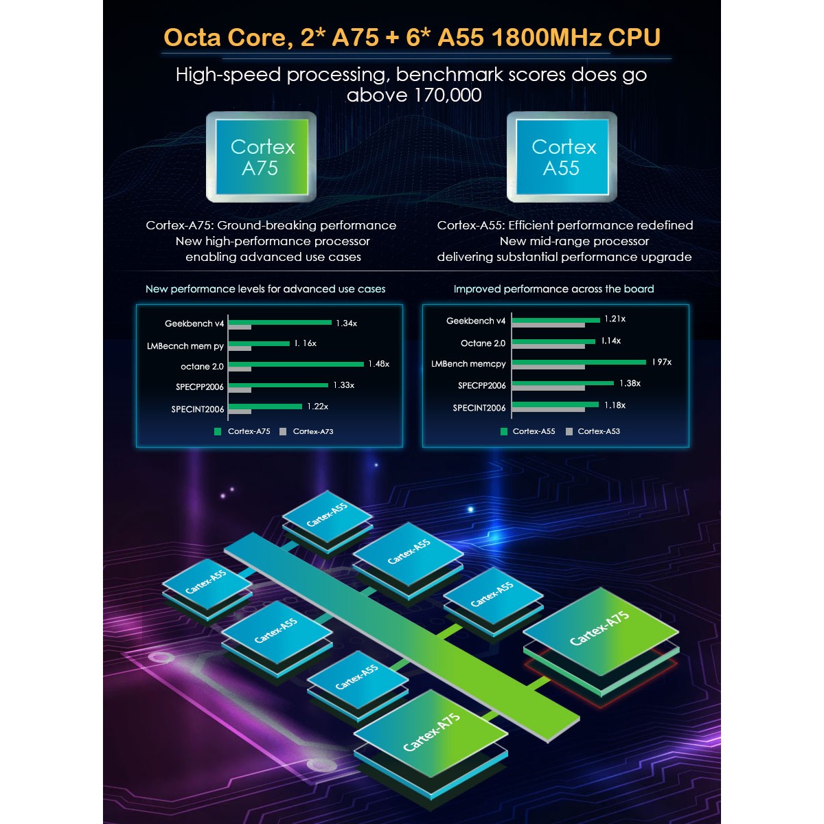 Разполага с последното поколение процесорна платка от ARM, която има 2 отделни физически процесора - 2-ядрен Cortex-A75 + 6-ядрен Cortex A55.